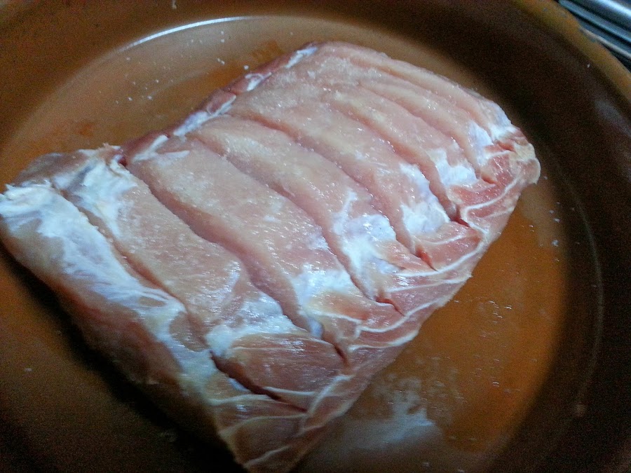 Marcamos la cinta de lomo y salamos restregando con las manos incluyendo en los cortes que hemos realizado. Colocamos en un recipiente para horno y espolvoreamos con pimienta.