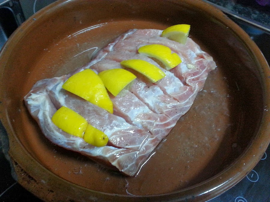 Bañamos con el zumo de medio limón, cortamos el otro medio y repartimos por la carne. Agregamos el vaso de vino blanco.