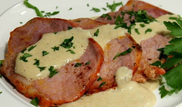 En una charola colocar las rodajas de lomo calientes, bañándolas con la salsa de crema y ornamentar con hojitas de perejil.