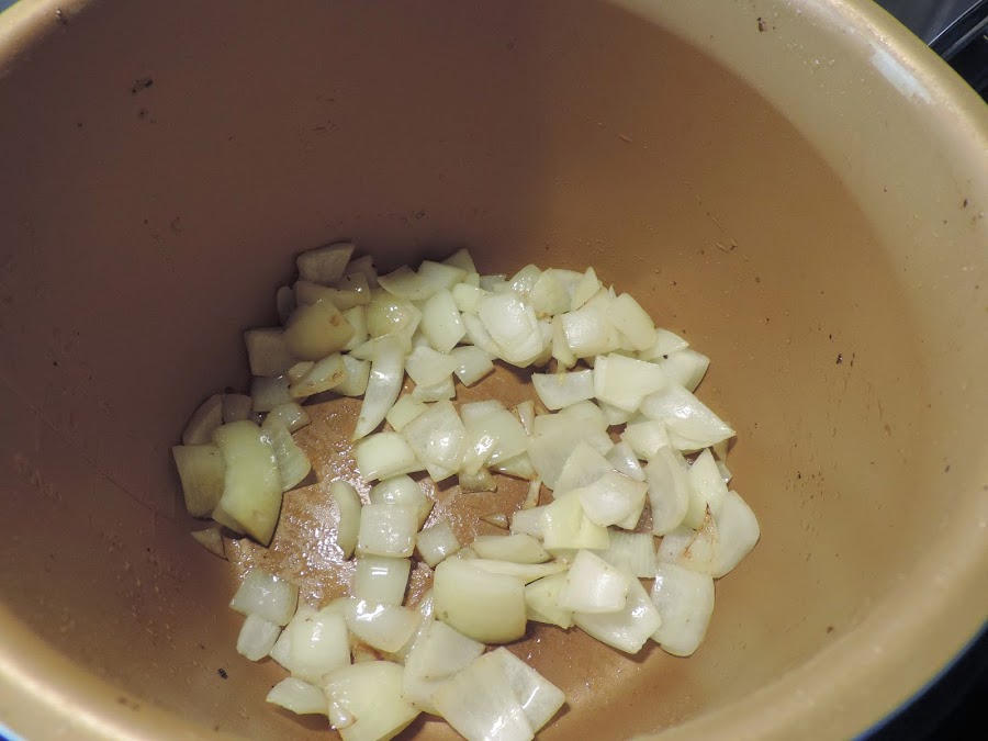 Añadimos la cebolla cortada en trozos a la cubeta con el jugo que haya soltado la carne, echar el aceite de oliva.