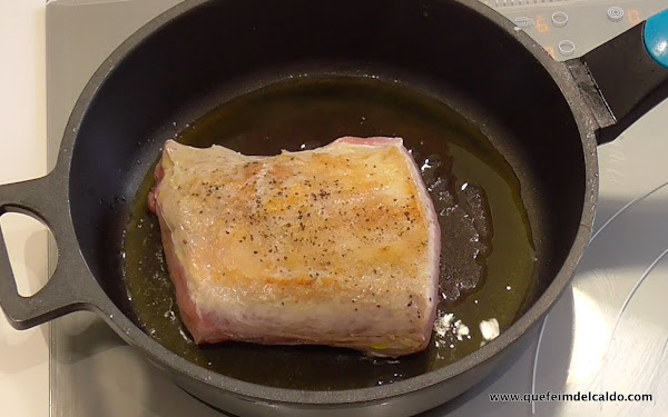 Mientras se está pochando las verduras marcamos el lomo de cerdo en una sartén con dos cucharadas soperas de aceite de oliva.