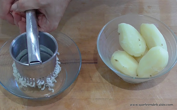 Una vez comprobadas que las patatas están bien cocida, alrededor de 21 minutos, dependiendo del grosor de la patata, lo pasamos por un tritura patatas o un tenedor o lo que tengáis en casa.