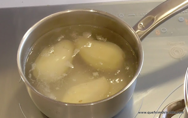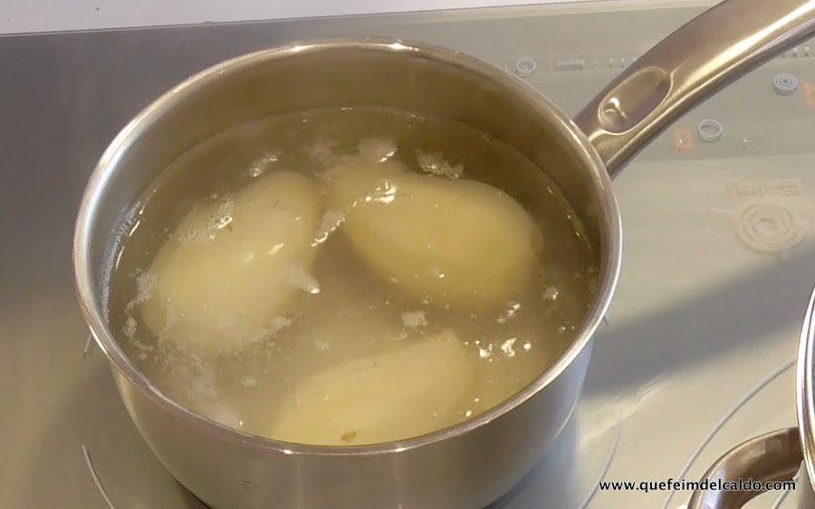Mientras tanto en otra cazuela ponemos las patatas a hervir para realizar nuestro puré de patatas, las patatas se introducen al agua cuando esté hirviendo, el agua le ponemos un poco de sal.