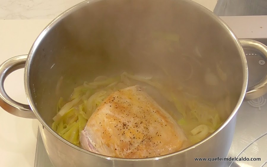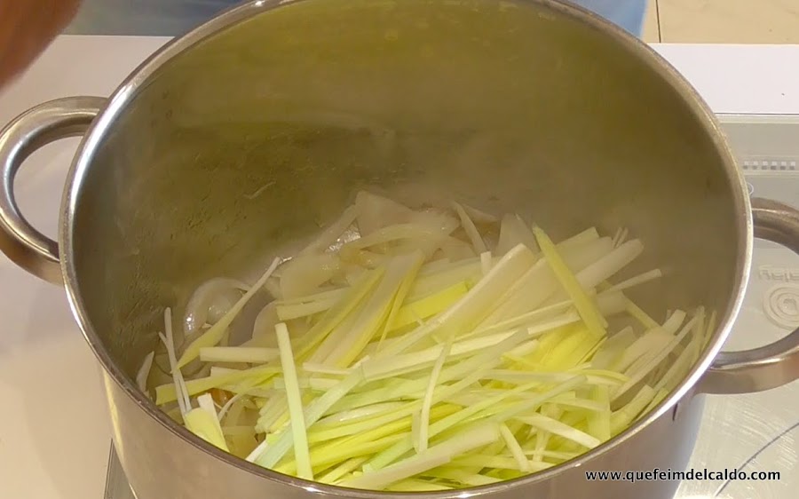 A continuación limpiamos el puerro y lo cortamos en bastones, lo introducimos también a la cazuela, lo dejamos cocinándose alrededor de 15 minutos a media potencia del fuego.