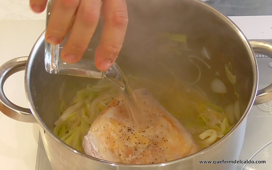 Una vez sellado el lomo de cerdo lo incorporamos a la cazuela.