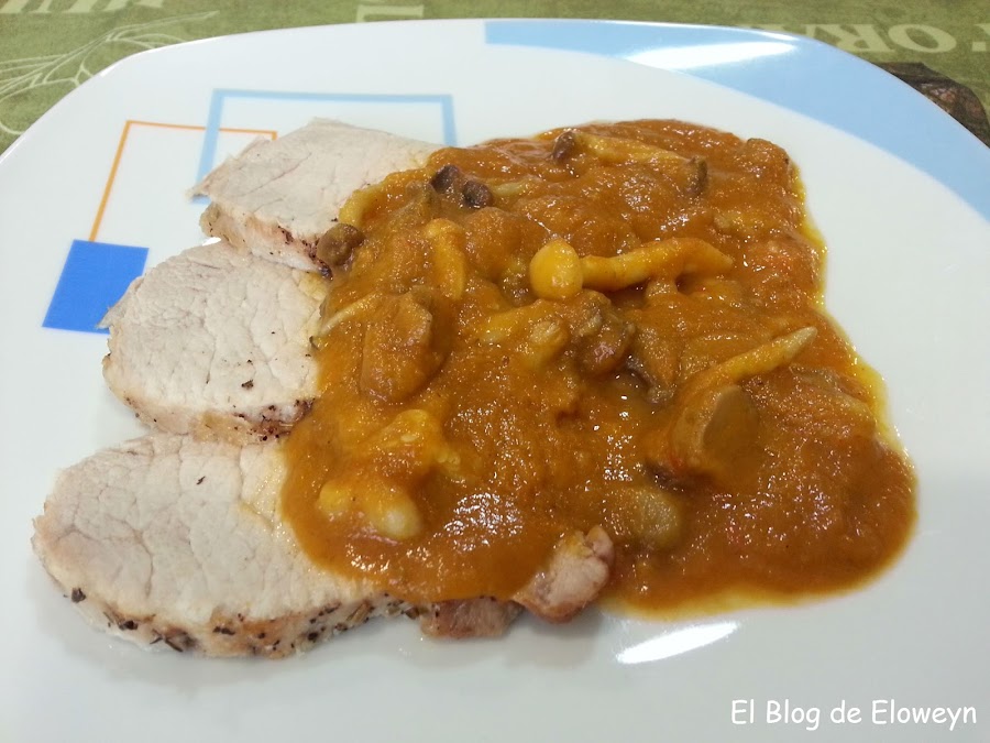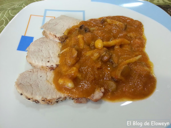 Montamos el plato poniendo el lomo y por encima la salsa de verduras con setas. Servimos inmediatamente.