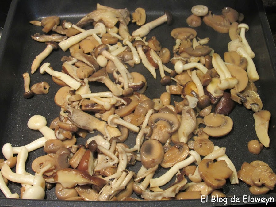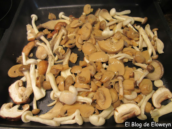 Mientras tanto, ponemos un poquito de aceite en una plancha y salteamos las setas y los champiñones.