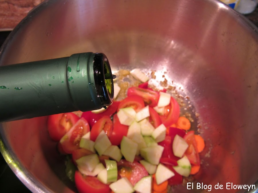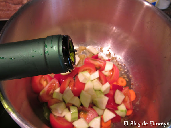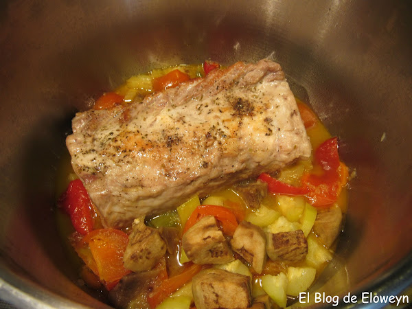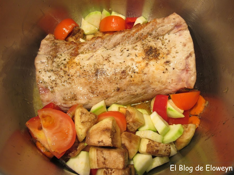 Pillé todo lo que tenía en la nevera. Cuantas más cosas echase, más entretenida estaría. Lavé las verduras, las pelé, las corté, y las fui pesando. Anotando metódicamente cada uno de los ingredientes y su peso en la libreta donde voy apuntando todas mis recetas y haciendo fotos del paso a paso. Y salió este lomo de cerdo con salsa de verduras y setas. ¡Buenísimo!