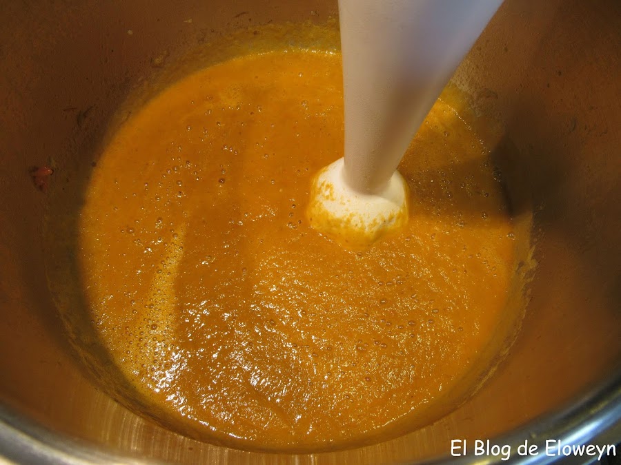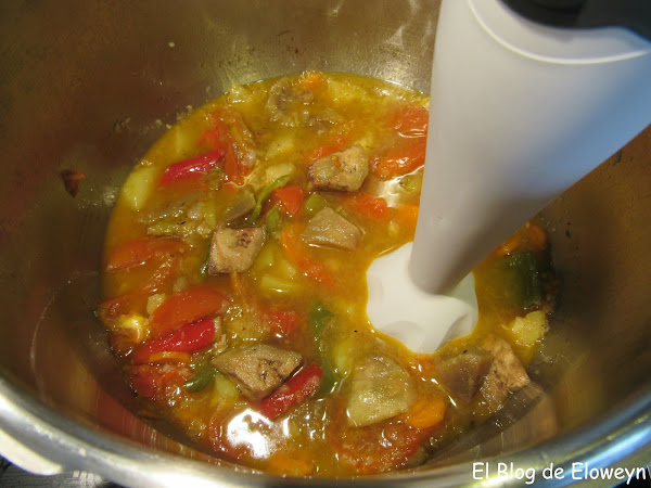 Quitamos la cinta de lomo y la reservamos en un lugar con cuidado de que no se enfríe. Trituramos las verduras con una batidora.