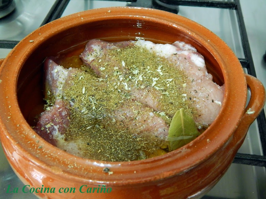 Unas 4 ó 5 horas antes de empezar, maceramos los trozos de carne con el comino, los ajos machacados con piel, el orégano, la pimienta, la sal y el zumo de limón. Dejamos reposar, moviéndolo de vez en cuando. Unas 5 horas por lo menos.