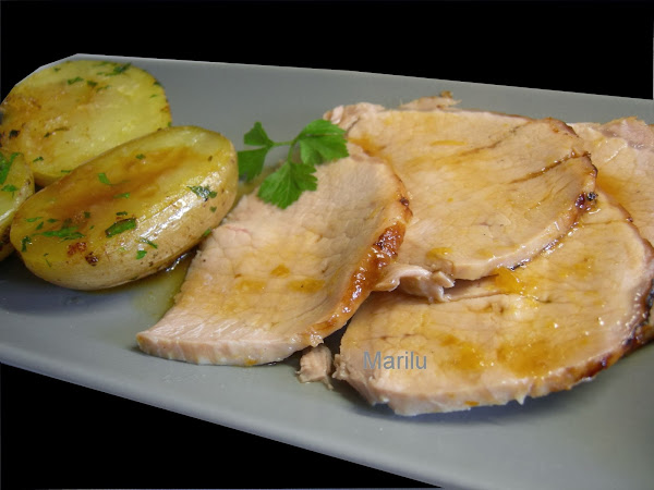 Dejamos cocinar, regando de vez en cuando con la salsa, hasta que ya esté hecho..El tiempo depende del tamaño del lomo. Yo para saber si ya está listo lo pincho con el cuchillo, o una brocheta, y aprieto para que salga el jugo de su interior,,Si este jugo sale de color blanco el lomo está listo,, si sale con algo de rojo, aún le falta tiempo.