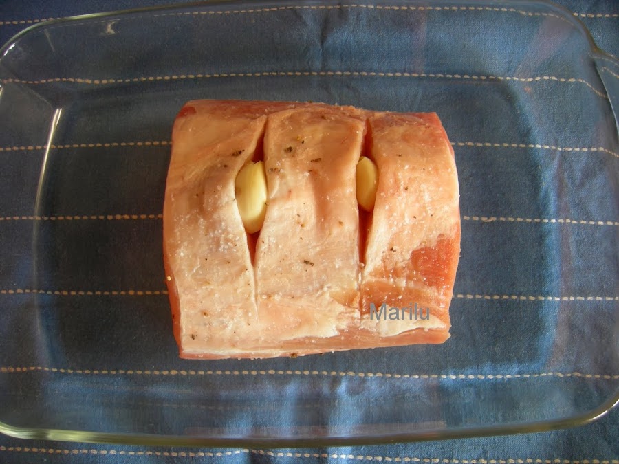 Regamos el lomo con esta salsa y metemos en el horno previamente calentado a 180º.