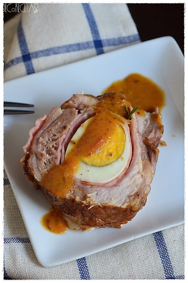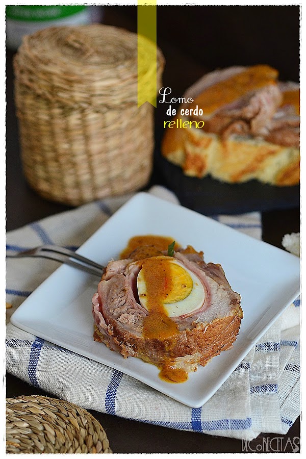 Abrimos la pieza de lomo como si de un libro se tratase. Recomiendo tener bien afilado el cuchillo y hacerlo poco a poco evitando cortar más de lo debido. Una vez abierta la pieza, salpimentamos y extendemos las láminas de jamón cocido, y los huevos. Empezamos a enrollar y atamos con cuerda de cocina.
