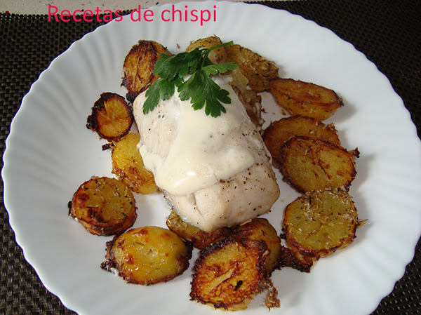 Pasado este tiempo salpimentar la merluza y colocar encima de las patatas y dejar hornear 8 minutos más. Luego poner un poco de mayonesa por encima y si se quiere gratinar un poco.