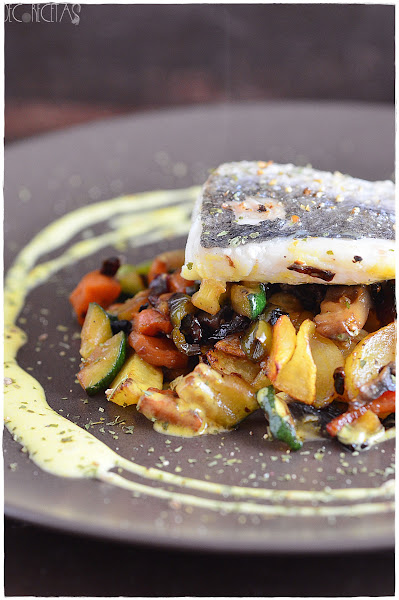 Emplatamos el plato poniendo como base, las patatas, encima las verduras y por último la merluza a la plancha. Hacemos una salsa de curry, pochando media cebolla, a la que agregamos dos cucharadas de curry y dejamos que tueste levemente. Por último, añadimos 200ml de nata (crema de leche) de cocinar y dejamos cocinar a fuego bajo por 5 minutos. meteremos en un biberón de cocinar para emplatar con con seguridad añadiendo un hilo alrededor