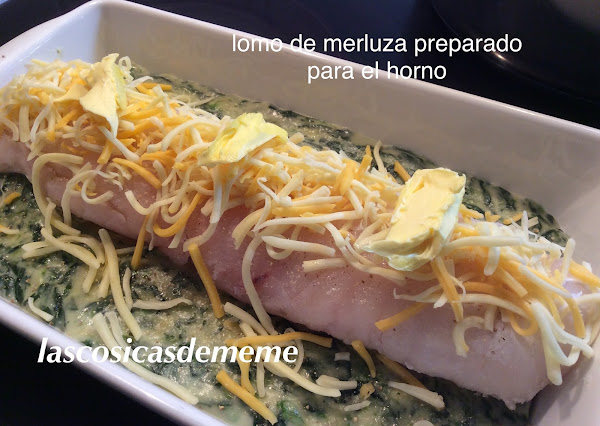 Ponemos la crema en una fuente de horno o en cazuelas individuales, ponemos encima el lomo de merluza con sal y pimienta, la dejamos un poco metida en la crema, espolvoreamos con el queso rallado ponemos encima unos trocitos de mantequilla.
