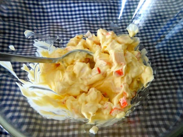Continuamos picando los palitos de surimi y mezclándolo con la mayonesa. Reserva.
