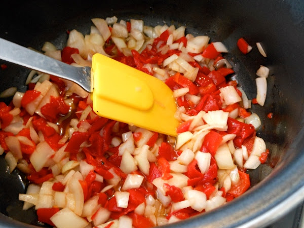 Cuando el aceite esté caliente añade la cebolla picada y los pimientos del piquillo previamente escurridos y troceados. Déjalos cocer a fuego medio con la cacerola tapada durante 10 minutos.