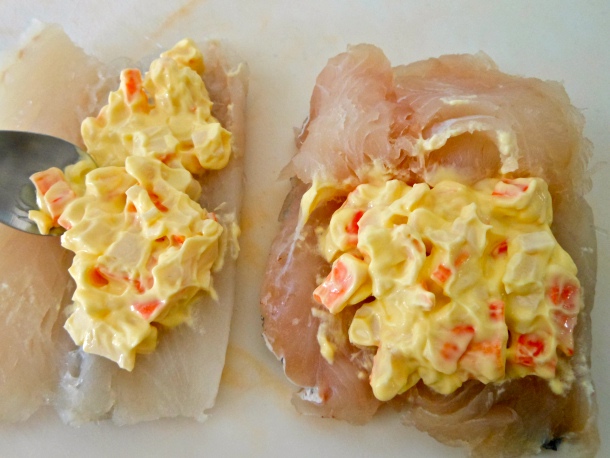 A continuación rellena los lomos de pescadilla con la mezcla de mayonesa y ciérralos.