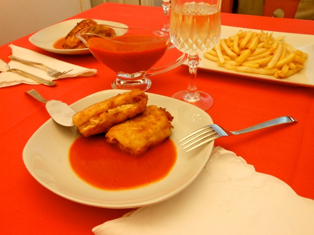 Coloca una base de salsa y sobre ella ponemos los lomos de pescadilla.