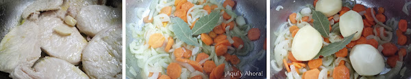 Sacamos la carne de la olla y lo reservamos. En la misma olla donde hemos sellado las rodajas de lomo rehogamos las cebollas y las zanahorias. Añadimos las patatas, el laurel, la pizca de sal y rehogamos las verduras.
