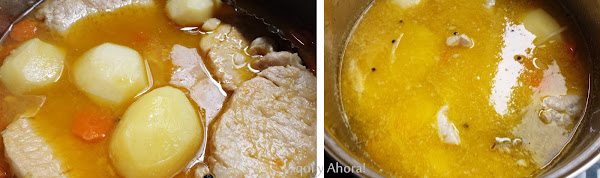 Dejamos los ingredientes que se vayan haciendo a fuego medio-suave. Cuando las patatas estén tiernas las retiramos y lo dejamos durante 1 hora aproximadamente o hasta que la carne esté tierna y el escabeche haya reducido. En los últimos minutos de cocción introducimos las patatas y le damos el último hervor para que se impregnen del sabor del escabeche.