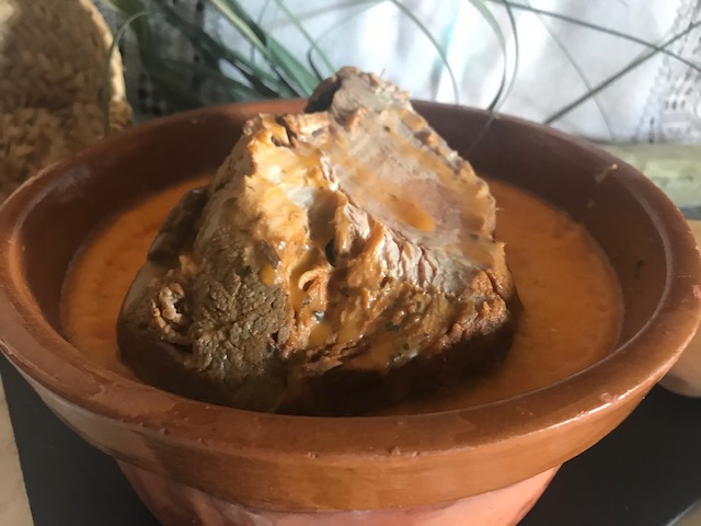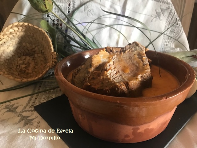 Destapamos la olla, si vemos que tiene agua, sacamos la carne, poniéndola en un recipiente alto de barro, dejamos que evapore hasta que se quede solo la grasa de la manteca y bañamos con toda la salsa por encima del lomo.