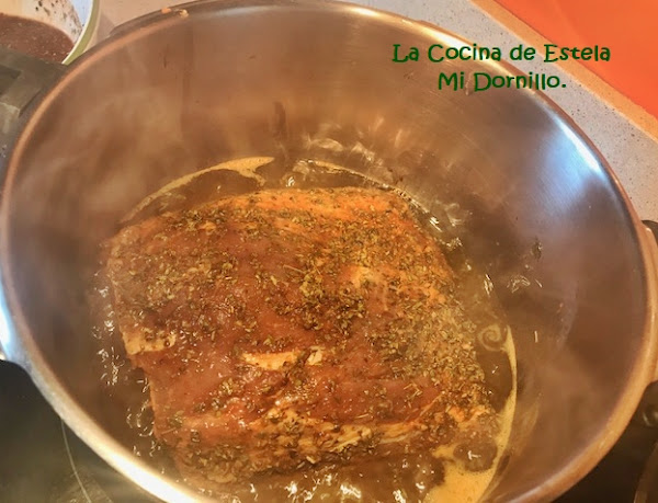 Añadimos la mezcla donde se macero el lomo y agua casi hasta cubrirlo y cerramos . Cuando sube la válvula, dejamos a temperatura media, durante 30 minutos si es cabeza de lomo, y unos 20 minutos si es lomo, ya que este se queda mas seco.