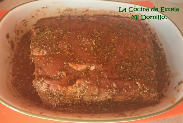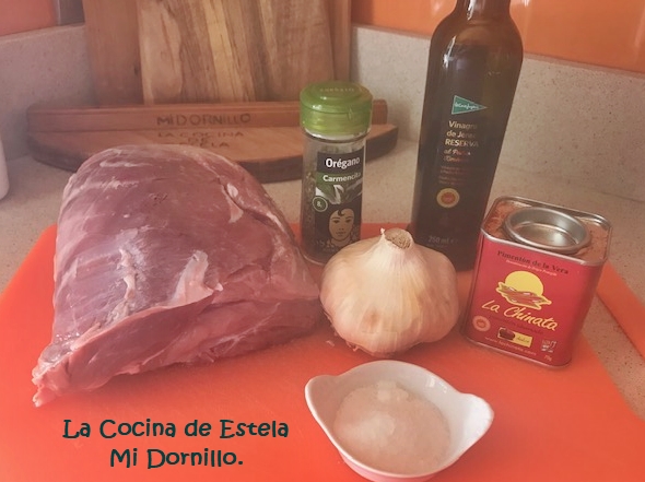 Majamos en un mortero los ajos pelados con la sal y lo mezclamos con el vinagre, el orégano y el pimentón y bañamos el lomo con esta mezcla. Yo lo dejo varias horas y a veces desde la noche anterior en la mezcla.