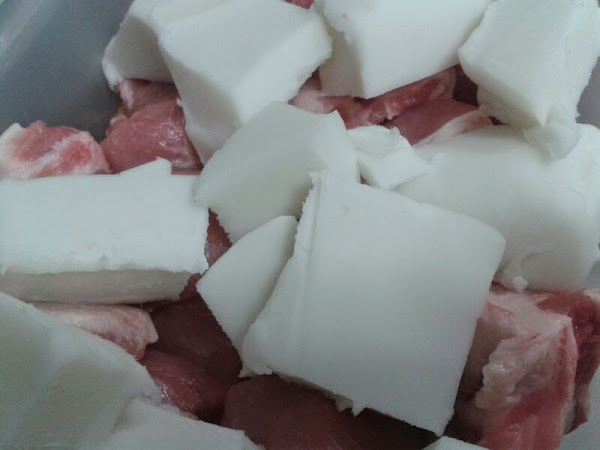 Comenzamos troceando el lomo en dados junto con la manteca y los colocamos en un recipiente.