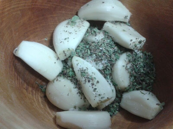 Pelamos la cabeza de ajos y ponemos los dientes en el mortero con el orégano y un poco de sal.