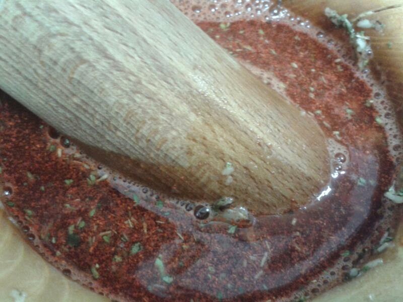 Trabajamos el conjunto en el mortero y le añadimos el pimentón y el vinagre. La cantidad de vinagre depende del gusto del cocinero. Personalmente me gusta ponerlo fuertecito de vinagre ya que en casa suele gustar así.