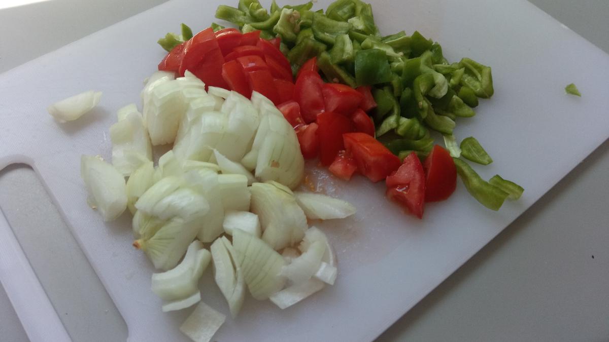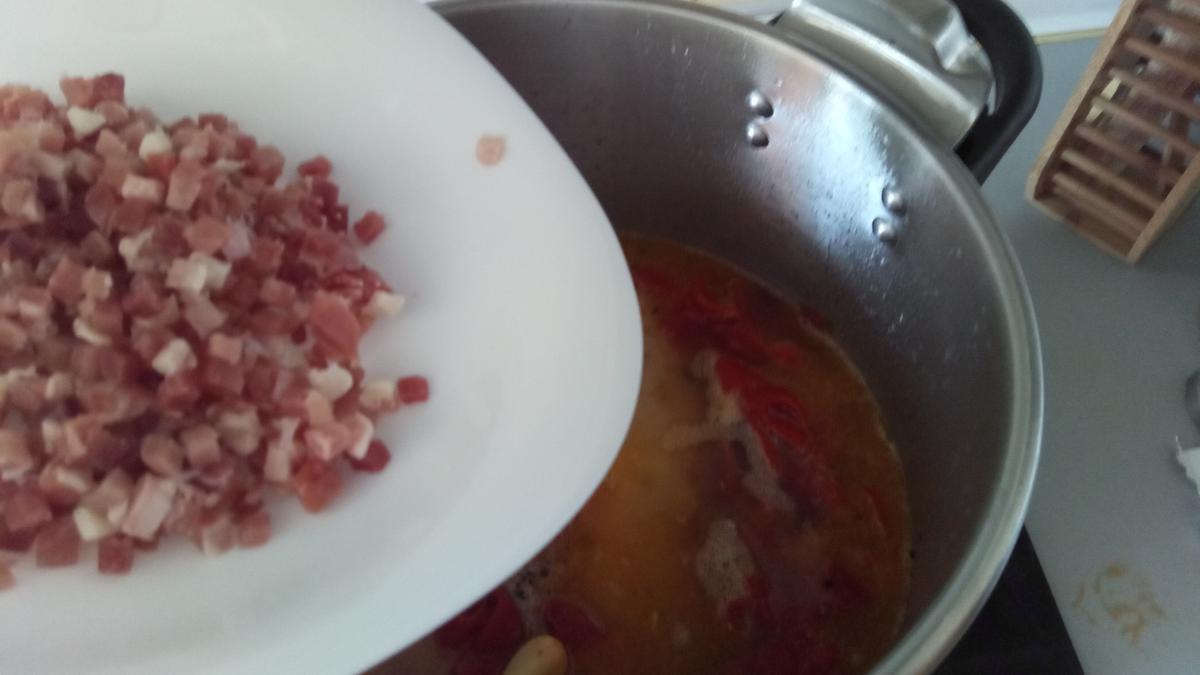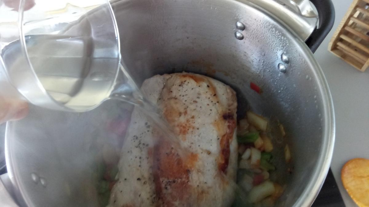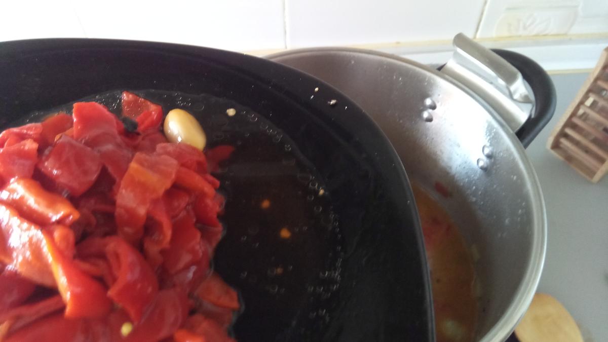En el mismo aceite echamos la cebolla, el pimiento verde, el tomate maduro cortados en trozos. Cocinamos un par de minutos, añadimos los pimientos en tiras y el jamón picado y el vino, dejamos que se evapore el alcohol. Agregamos el agua, el concentrado de carne, el laurel y el perejil.
