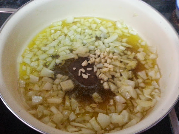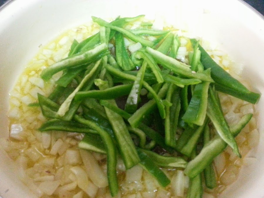 En una sartén con aceite, sofreímos la cebolla. Al poco, añadimos los ajos bien picados. Poco después, agregamos los pimientos cortados en tiras.
