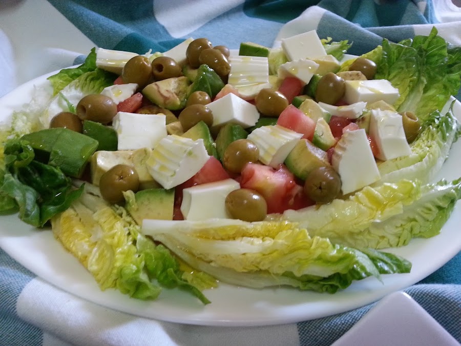 Hemos completado la comida con una ensalada de aguacate, lechuga, queso de Burgos, tomate y aceitunas.