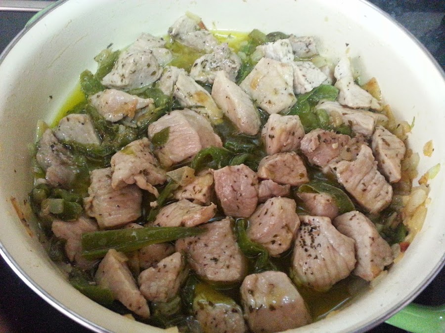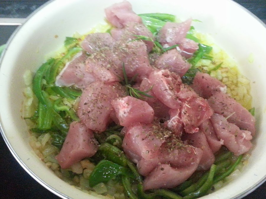 Cuando el pimiento esté medio hecho, añadimos la carne y espolvoreamos bien con tomillo.