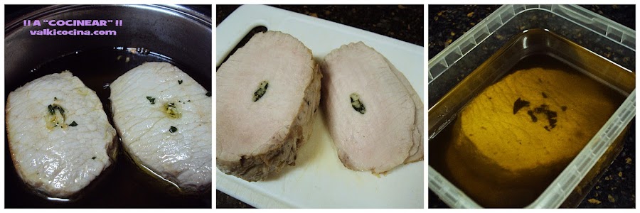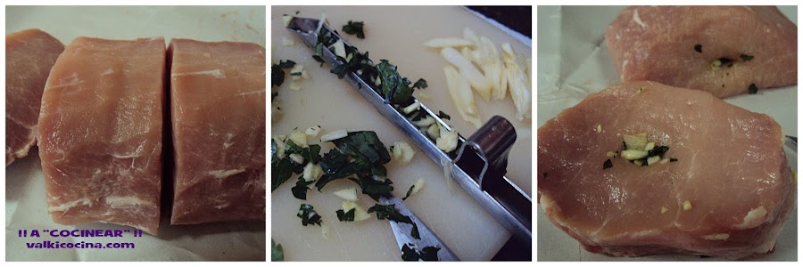 Cortamos en trozos de un tamaño aproximado de tres dedos ..., y con ayuda de una aguja mechadora, o haciendo un corte fino con ayuda de un cuchillo, introducimos ajo en tiras y perejil. ( Si no te apetece mecharlo, sin problemas ... ).