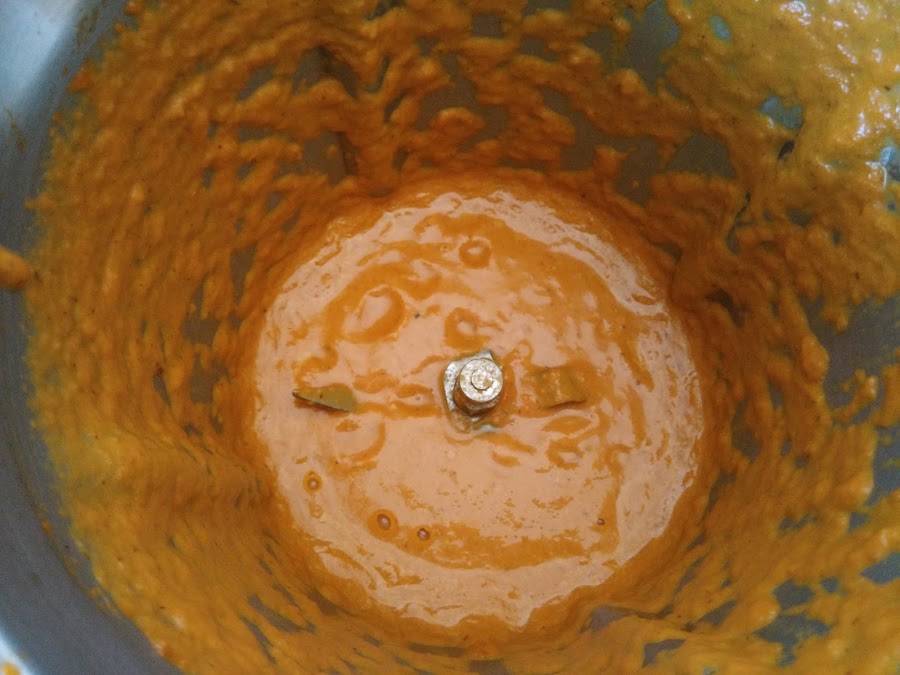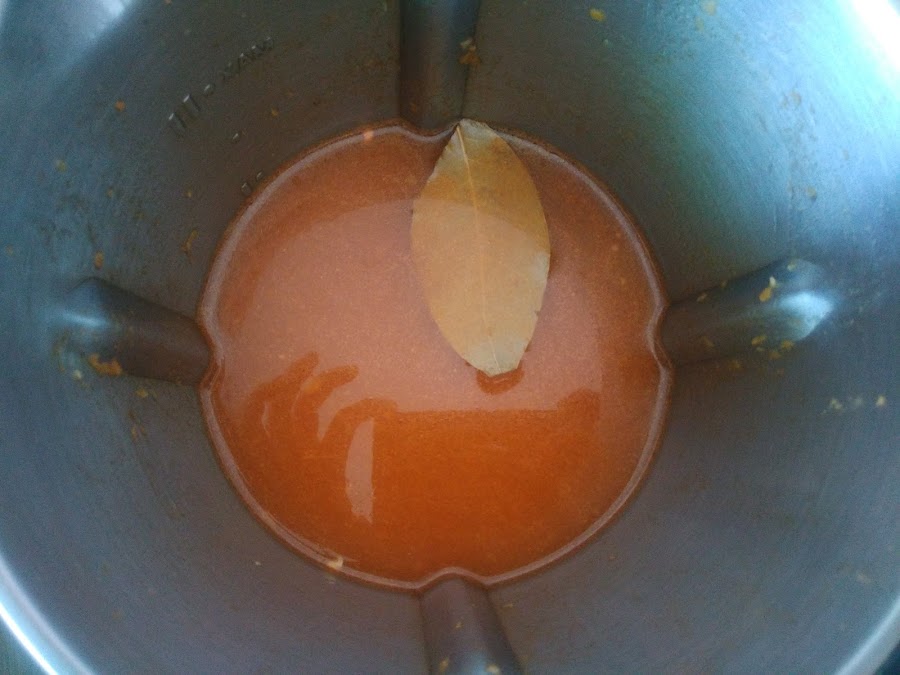 Retiramos la hoja de laurel y trituramos la salsa a vel 5 durante 1 min, o esperamos a que enfríe ligeramente para poder triturar a vel progresiva 5-8.