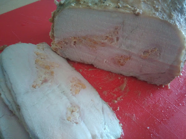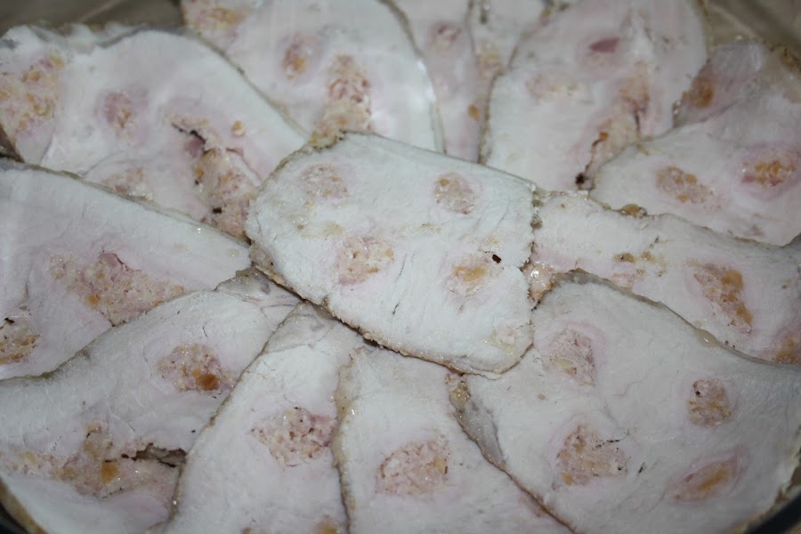 Con un cuchillo vamos haciendo unos pequeños orificios en el lomo, introducimos un dedo para hacerlo un pelin mas grande y vamos introduciendo el relleno poco a poco.