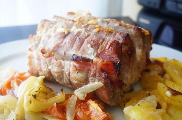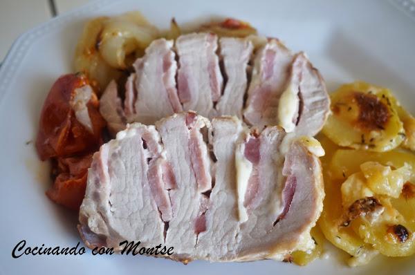 Esta receta, es un lomo relleno al horno, sencillo y muy rico. La presentación es estupenda y queda muy jugosa, con el relleno que le puse de beicon y queso.