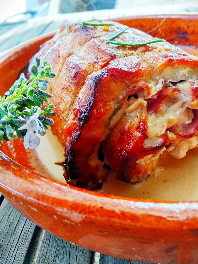Una vez abierto el lomo, se salpimenta al gusto y se rellena con el beicon y el queso. Yo he usado un queso curado en aceite de oliva, que es muy cremoso y que me encanta, podéis usar el que más os guste.
