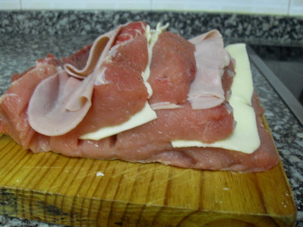 En cada abertura poner lonchas de queso y de jamón cocido. Bridar con hilo de cocina.