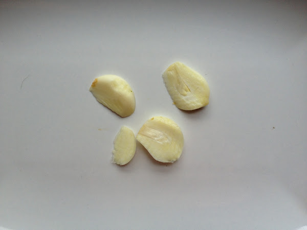7 Animo que ya esta casi listo¡¡¡. Ahora vamos a preparar la salsa de ajo, es muy fácil. Es tan sencillo como coger un diente de ajo, lo pelamos y los cortamos por la mitad.