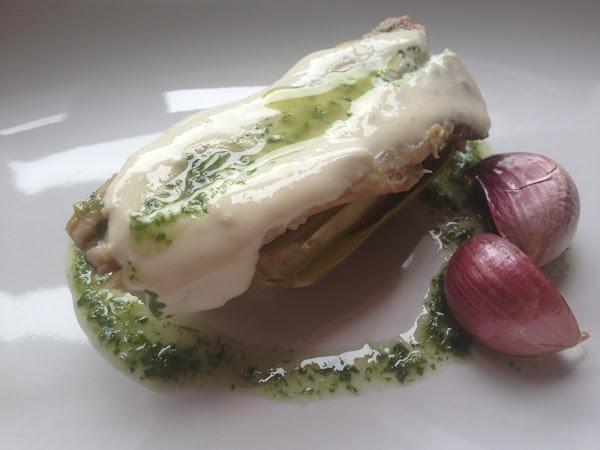 Es momento y con mucho cariño, colocamos el lomito de chicharrin sobre la alcachofa.