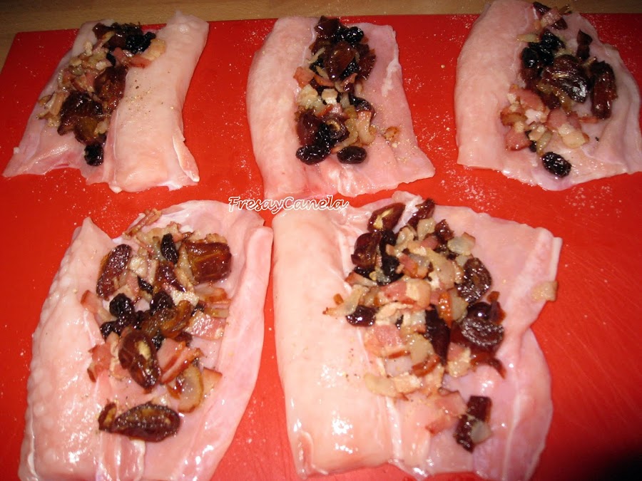 1 bandeja de lomos de conejo, 1 cebolla, 6-8 dátiles, un puñado de pasas sin pepitas, 1/2 paquete de bacon, sal, mix de pimientas, 1 pastilla de caldo de ave, 1 cucharadita de maicena, 1 vaso y medio de vermut blanco extra-seco, AOVE.