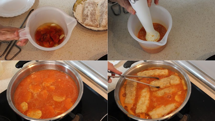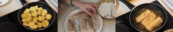 Les ponemos sal y pimienta molida a los lomos de merluza, los pasamos por harina y los freímos en el aceite de freír las patatas. Los sacamos y reservamos.