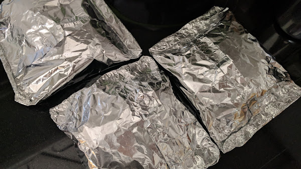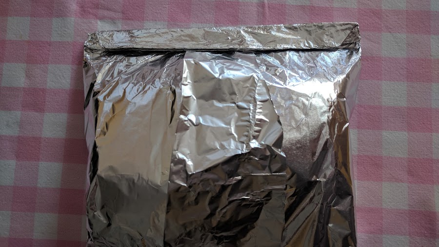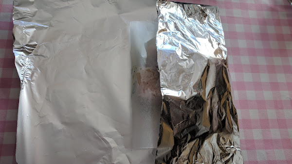 Partimos 4 rectángulos de papel de aluminio resistente al horno y otros 4 rectángulos, algo más pequeños, de papel de horno