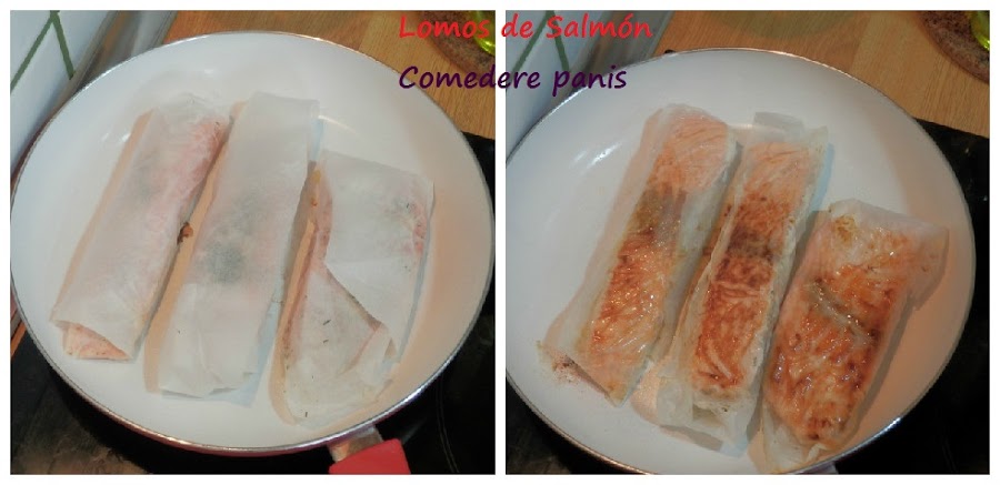 Coloca una gota de aceite en la sartén y con una servilleta extiéndela por todo el fondo de la sartén. Calienta la sartén a fuego medio y cuando esté caliente coloca los lomos de salmón envueltos en el papel, cocina los lomos unos 4 minutos por cada lado.