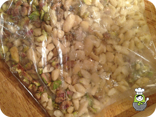 Por otro lado, metemos las almendras y los pistachos en una bolsa de plástico y, con la ayuda de un rodillo, picamos la mezcla en pedazos grandes.