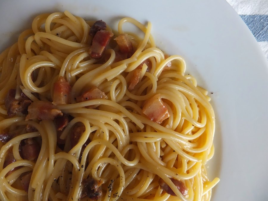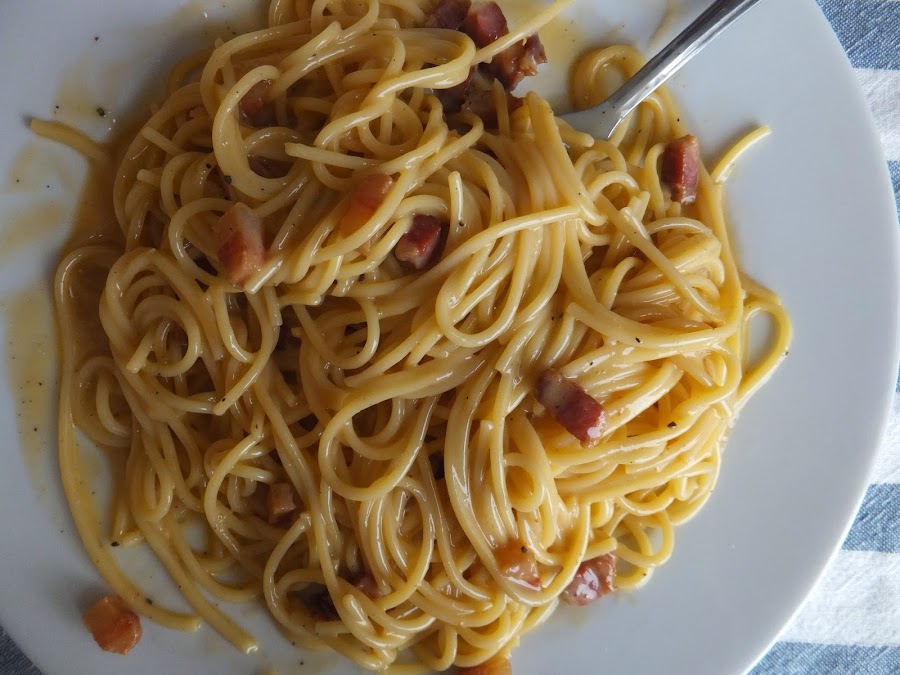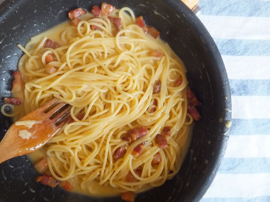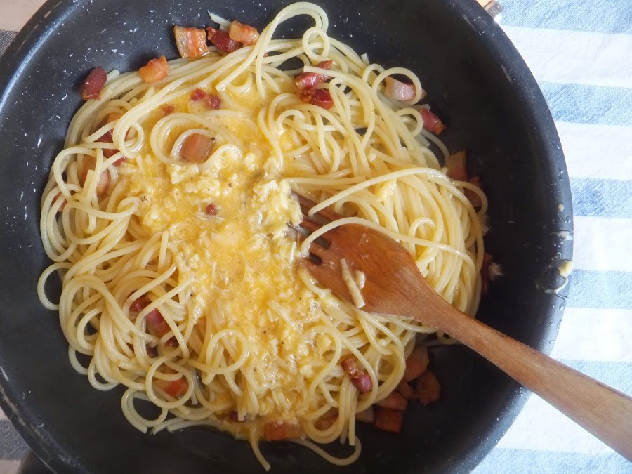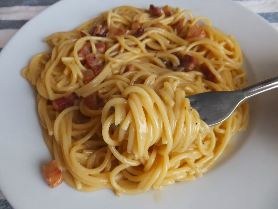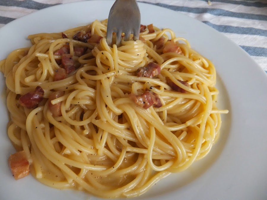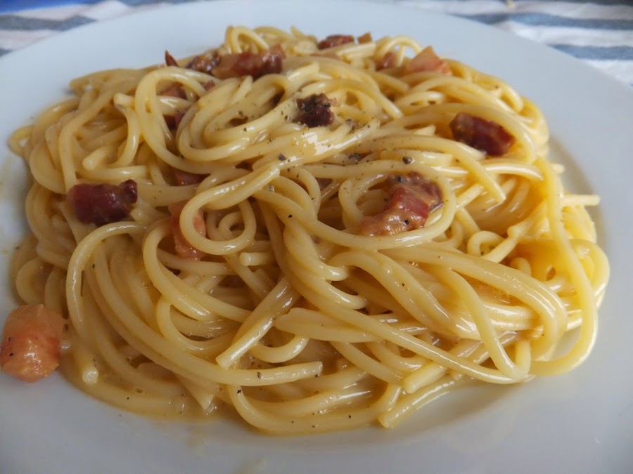 Si sueles preparar los espagueti a la carbonara con nata (crema de leche), champiñones o incluso cebolla deberías saber que según la cocina italiana más tradicional estas comentiendo un delito capaz de escandalizar a más de un romano. Si lo que haces es comprarla en bote o en sobres no solo cometes un delito sino que además estas llevando a cabo un acto imposible ya que la salsa de la de la carbonara original no es sino una mezcla de huevo crudo batido y queso que al mezclarla con la pasta aún caliente crea un manto brillante, cremoso y delicioso absolutamente imposible de enfrascar.
